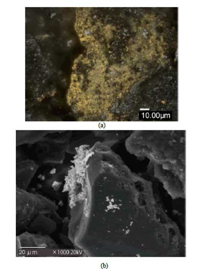圖2:(a)放大2000倍的活性炭在其表面上沉積金屬Au的光學(xué)顯微照片的圖像。(b)具有沉積的金屬Au的活性炭的SEM圖像。