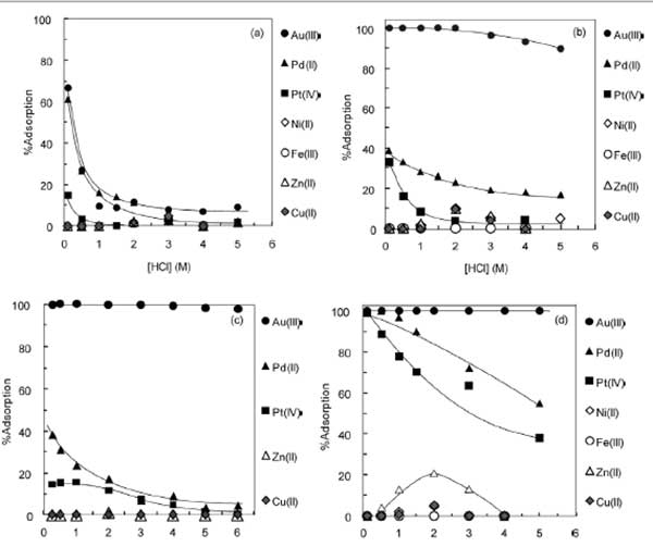在酸性氯化物介質(zhì)中,Au(III),Pd(II)和Pt(IV)分別生成穩(wěn)定的陰離子氯化物配合物,如AuCl 4 -,PdCl 4 2-和PtCl 6 2-,而大部分堿Ni(II),Zn(II)和Cu(II)等金屬離子以陽離子或中性形式存在,陰離子氯絡(luò)合物的濃度只有在Fe(III)情況下氯離子濃度較高時(shí)才有意義。圖3a-3d顯示了在不同的HCl濃度下,一些貴金屬和堿金屬離子在微藻殘余物,活性炭上的吸附%。