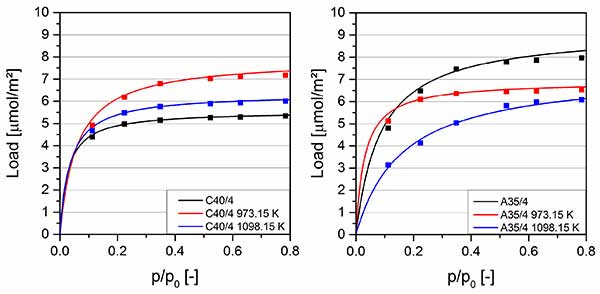 圖2顯示極性溶劑丙酮在25攝氏度的吸附等溫線。未涂覆的活性炭A35/4與活性炭C40/4相比的負載顯著較高。兩種碳都是由相同的原料制造的,但活性炭A35/4在水蒸氣氣氛中經(jīng)過較長時間的活化。由于原始生產(chǎn)過程中氧化條件下活化時間較長,活性炭A35/4具有較高的極性表面基團數(shù)量,有利于極性丙酮的吸附。在700攝氏度下涂覆的樣品的負載對于兩種類型的活性炭具有相同的數(shù)量級,因為由于內(nèi)部孔系統(tǒng)的涂覆,表面特性的差異減小,并且表面化學(xué)的相關(guān)修改。2涂層和極性丙酮,極性活性炭A35/4上的負載僅略有變化。在820攝氏度下涂覆的樣品也具有可比較的負載。由于非極性SiC涂層和由此導(dǎo)致的較弱的相互作用,負載低于在700攝氏度下涂覆的樣品的負載。