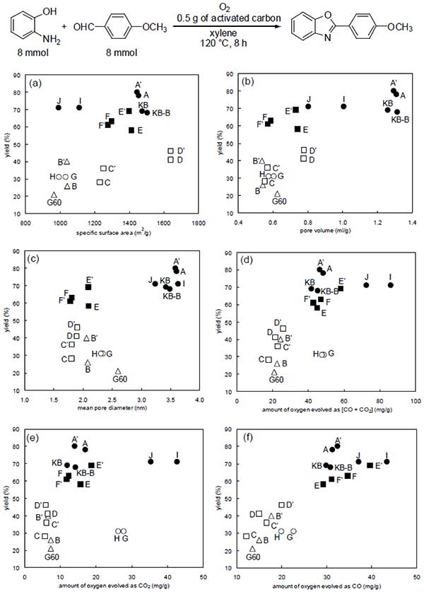 圖2顯示了活性炭的性質(zhì)與氧化芳構(gòu)化產(chǎn)率之間的關(guān)系。很明顯,化學(xué)活性炭(圖2中的實(shí)心符號)比蒸汽活性炭(未填充符號○□△)具有更高的反應(yīng)性。然后,我們將注意力轉(zhuǎn)向表面氧基團(tuán),因?yàn)榛瘜W(xué)活化方法通常在比蒸汽活化方法更低的溫度下進(jìn)行,因此通過前一種方法獲得的活性炭表面上保留了更多的表面氧基團(tuán)。如在所示圖2(f)中,其演變?yōu)镃O表面氧基具有提高檢查的所有特性中的反應(yīng)產(chǎn)率的最佳趨勢??傃趿恳訡O和CO 2形式出現(xiàn)而作為CO 2放出的氧氣量與反應(yīng)產(chǎn)率沒有很強(qiáng)的關(guān)系[ 圖2(d),(e)]。在這里,CO將來源于苯酚,羰基和醌基團(tuán),CO 2將來自存在于原始活性炭表面上的羧基和內(nèi)酯基團(tuán)。比表面積,孔體積和平均孔徑似乎與反應(yīng)產(chǎn)率幾乎沒有關(guān)系[ 圖2(a),(b),(c)]。