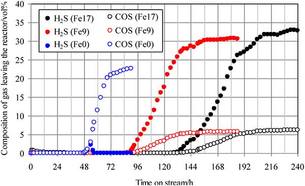 在沒有蒸汽的進(jìn)料氣流下進(jìn)行的實(shí)驗(yàn)室測試中,F(xiàn)e含量為0-17%,突破時間從48小時增加到136小時。Fe負(fù)載活性炭表面促進(jìn)了COS+H 2 →H 2 S+CO反應(yīng)。采用Fe負(fù)載活性炭同時去除H 2 S和COS,利用蒸汽進(jìn)料氣流,促進(jìn)反應(yīng)COS+H 2 O→H 2 S+CO 2和水煤氣變換反應(yīng)。蒸汽的突破時間幾乎與沒有蒸汽的突破時間相同。然而,含硫化合物對蒸汽的吸附能力高于沒有蒸汽的吸附能力。