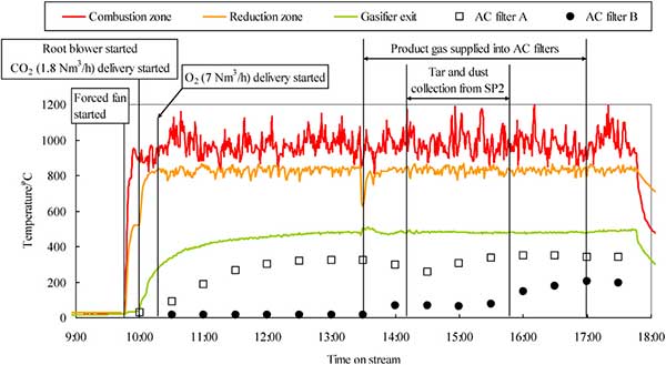 圖2顯示了作為時間函數(shù)的氣化器(燃燒區(qū),還原區(qū)和氣化器出口)和活化的過濾器A和B的溫度變化。在富氧空氣/CO2氣化操作(10:23-17:41)期間,燃燒區(qū)(900-1200℃)的溫度足夠高,而還原區(qū)和氣化器出口的溫度保持穩(wěn)定在大約820和480℃。當(dāng)產(chǎn)品氣體通過兩個活化的過濾器(13:30-17:00)時,過濾器A和B的溫度分別為250-350和10-200℃。盡管沒有示出,活化的過濾器A和B的溫度穩(wěn)定在320-350和60-170℃,其中從每個采樣口收集焦油,顆粒和氣體。