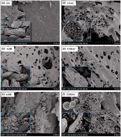 圖1顯示了合成的活性炭及其前體的形態(tài)。木質(zhì)纖維素和水熱材料孔隙度低,表面相當(dāng)粗糙。這些觀察結(jié)果與它們的低S BET和總孔體積相匹配。GSH中的微球在圖1中可見,是由GS在熱液碳化過程中的高纖維素組分形成的。但木質(zhì)素含量高可能會阻止氫化活性炭樣品中大量碳球的形成。此外,水熱過程中纖維素和木質(zhì)素的分解較弱,可能是氫化活性炭孔隙發(fā)育不良的原因。當(dāng)木質(zhì)纖維素材料在高溫下熱解時,生物活性炭的形態(tài)可以觀察到顯著的變化。生物活性炭的表面形態(tài)示出發(fā)達(dá)的孔隙和相當(dāng)高的表面積,并且因此,生物活性炭可以被認(rèn)為是一個綠色的吸附劑在廢水處理過程中使用。