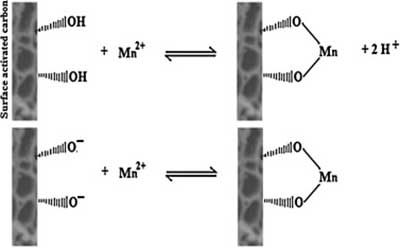 制備的活性炭表面含有氧和芳族化合物的官能團(tuán)。這些團(tuán)體可以參與化學(xué)鍵合,負(fù)責(zé)活性炭的陽離子交換能力。因此,活性炭/錳反應(yīng)可以用兩種方式表示(圖2)。根據(jù)此圖,離子交換的可能機(jī)制可以被認(rèn)為是一個(gè)錳離子(Mn2 +),其自身附著在兩個(gè)相鄰的羥基和雙氧基上,可以將兩對(duì)電子給予金屬離子,形成四個(gè)配位數(shù)化合物并將兩個(gè)氫離子釋放到溶液中。