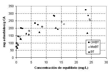在圖1上的原始活性炭BT的(F),所述OHBT和濕潤(rùn)活性炭吸附等溫線(xiàn)至pH 5。它被理解的是,最大吸附發(fā)生用于OHBT隨后MEBT目前, BT是最不吸附的?;钚蕴课饺萘康脑黾优c苯并噻唑分子中甲基或羥基取代基的存在有關(guān)。