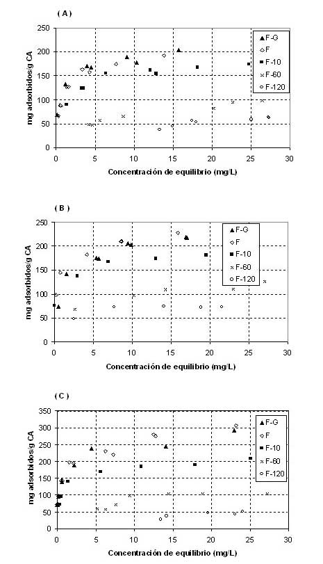 活性炭呈現(xiàn)基本特性pH值PZC接近9. OHBT相對(duì)于MeBT和BT的吸附容量的增加可能與芳族體系中電子密度的增加有關(guān)。與甲基相比,羥基增加了芳族體系的電子密度。苯并噻唑分子中羥基和甲基的存在引起B(yǎng)T分子的芳族體系的電子密度增加,增加了原始活性炭的吸附能力。吸附能力的增加與苯并噻唑芳環(huán)的π電子體系和碳石墨平面的電子π能帶之間的分散力的增強(qiáng)有關(guān)。在圖2A,2B和2C分別示出了BT的吸附等溫線(xiàn),和OHBT MEBT上經(jīng)歷與臭氧預(yù)處理10分鐘,(F-10),60分鐘(F-60)120分鐘活性炭(F- 120),并在氮?dú)饬?FG)下在1,000℃下脫氧。