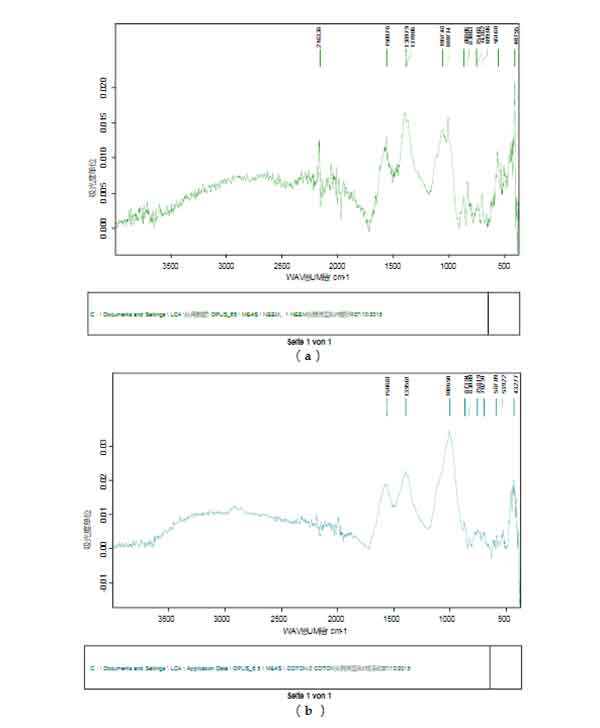 圖1. (a )來(lái)自棉籽皮的活性炭的FTIR光譜; (b )來(lái)自棉花的活性炭的FTIR光譜。