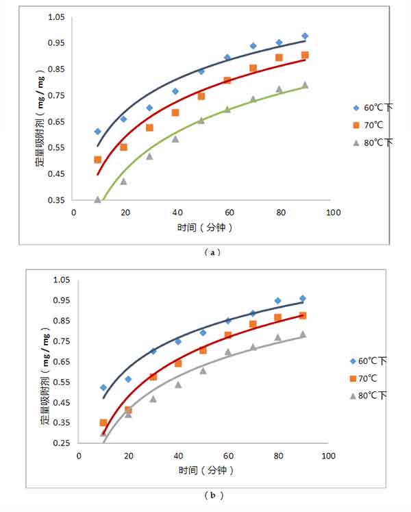 圖2。(a)使用來(lái)自棉花的活性炭脫色棉籽油的吸附動(dòng)力學(xué)(b )使用來(lái)自棉籽皮的活性炭對(duì)棉籽油脫色的吸附動(dòng)力學(xué)。